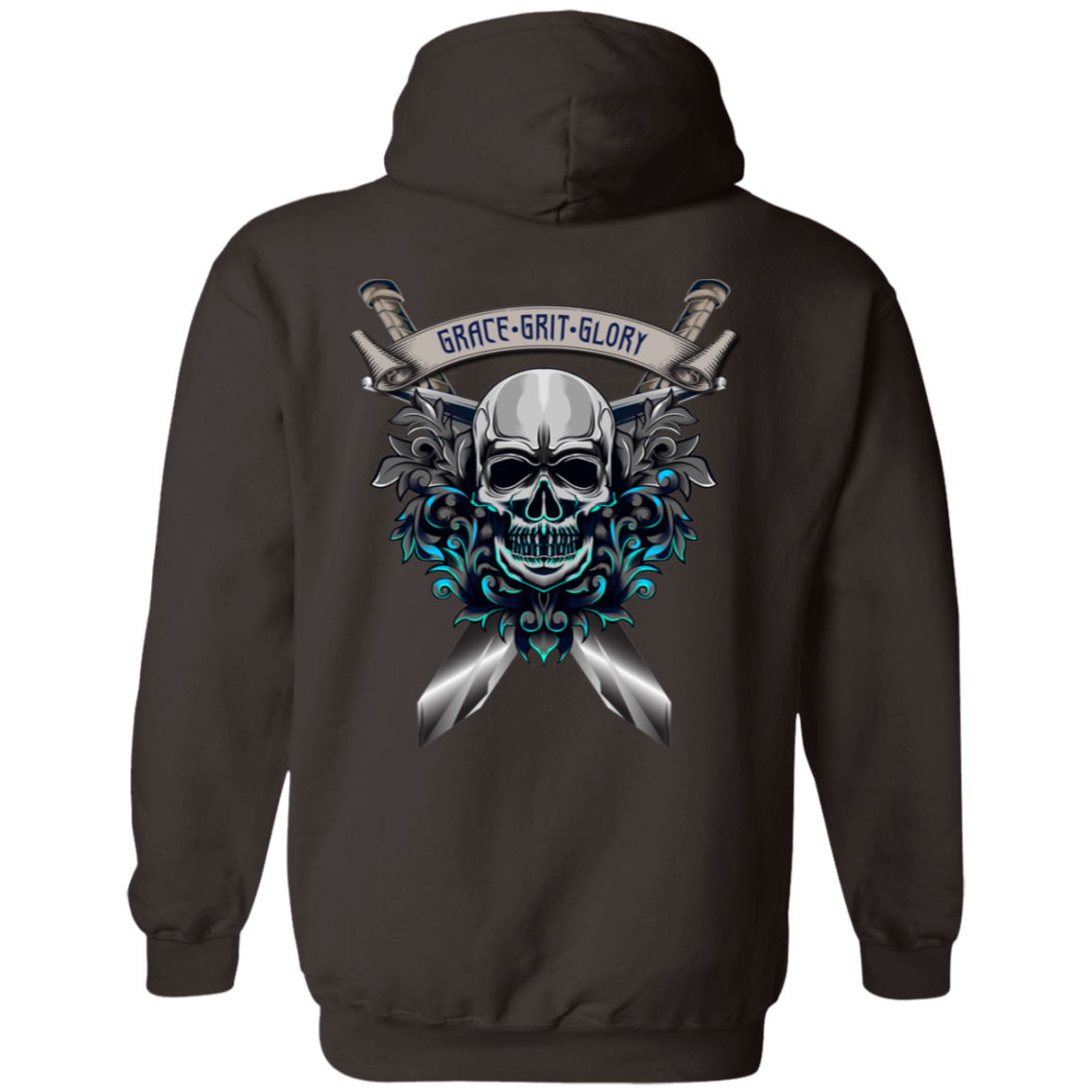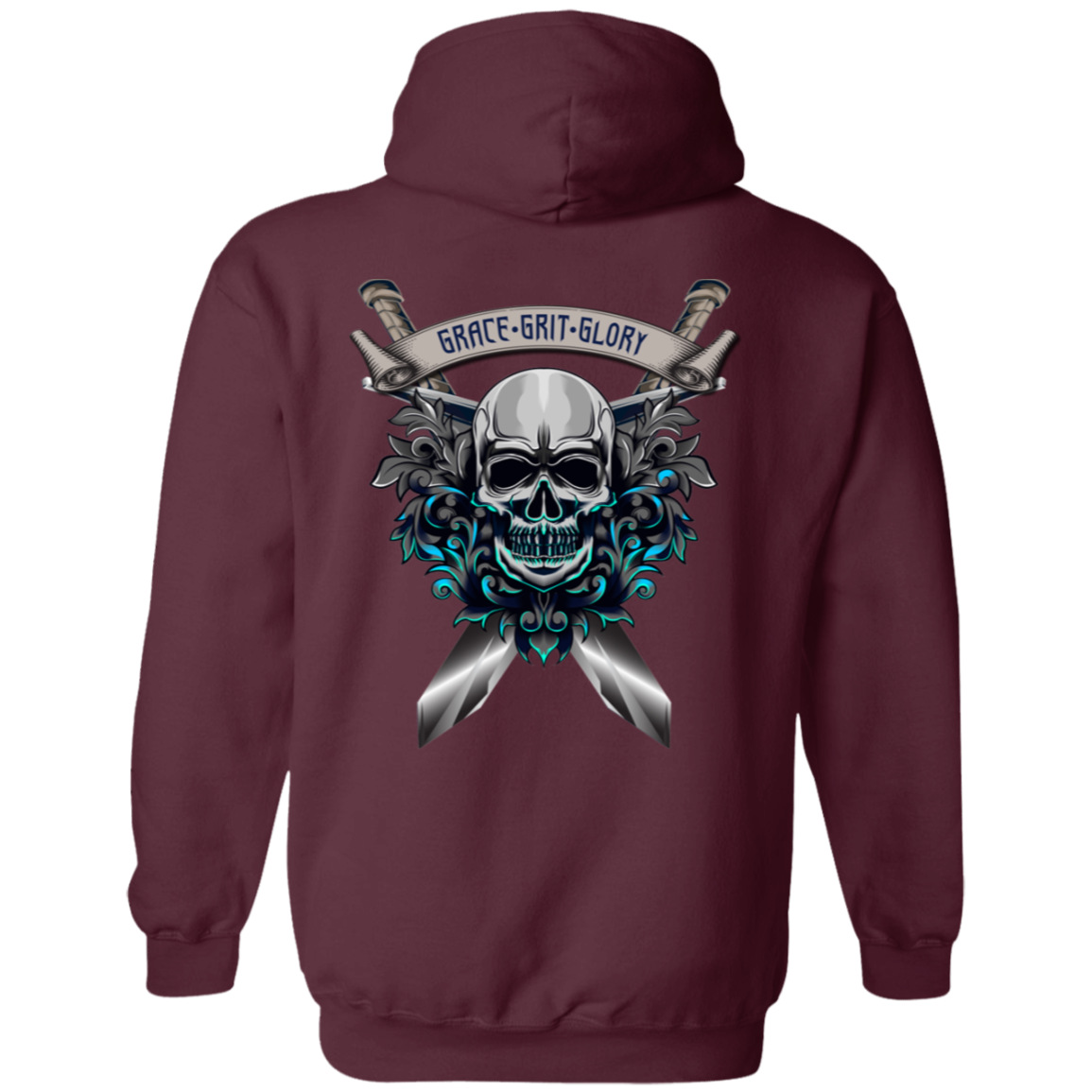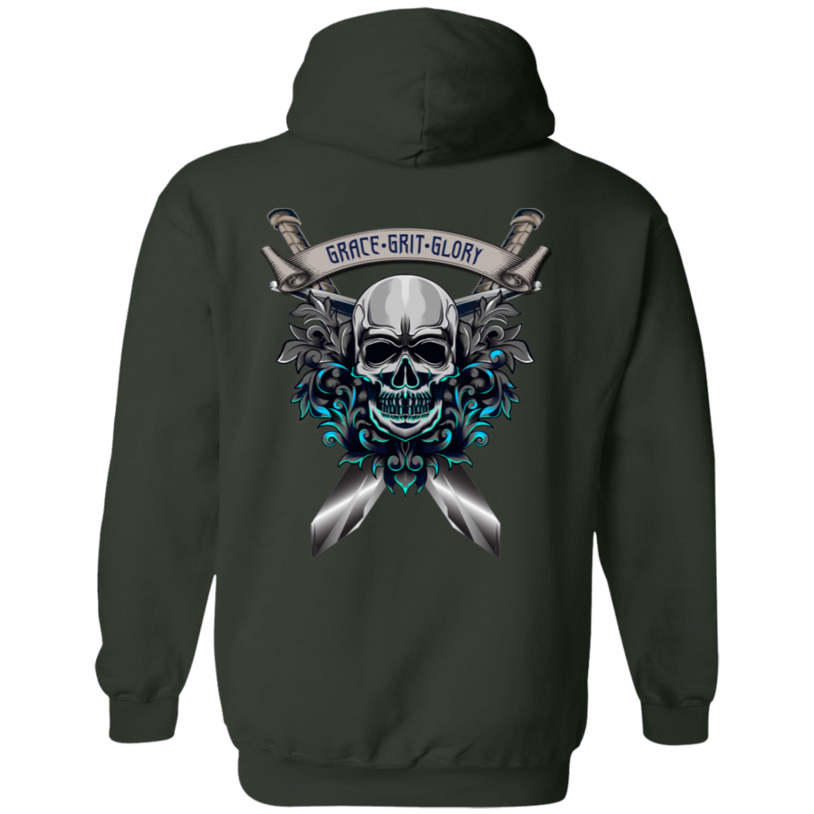At the heart of this sweatshirt lies a captivating skull surrounded by ethereal smoky flowers, all bathed in a vibrant blue hue. Two crossed swords add an edgy touch, symbolizing strength and the courage to face challenges head-on. Above this powerful imagery, the empowering words "Grace Grit Glory" declare a mantra of poise, determination, and triumph.